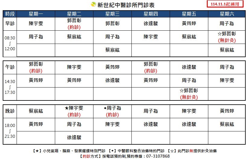 [週六晚診]-翁顥溱醫師取消門診,新增蔡宸紘醫師門診