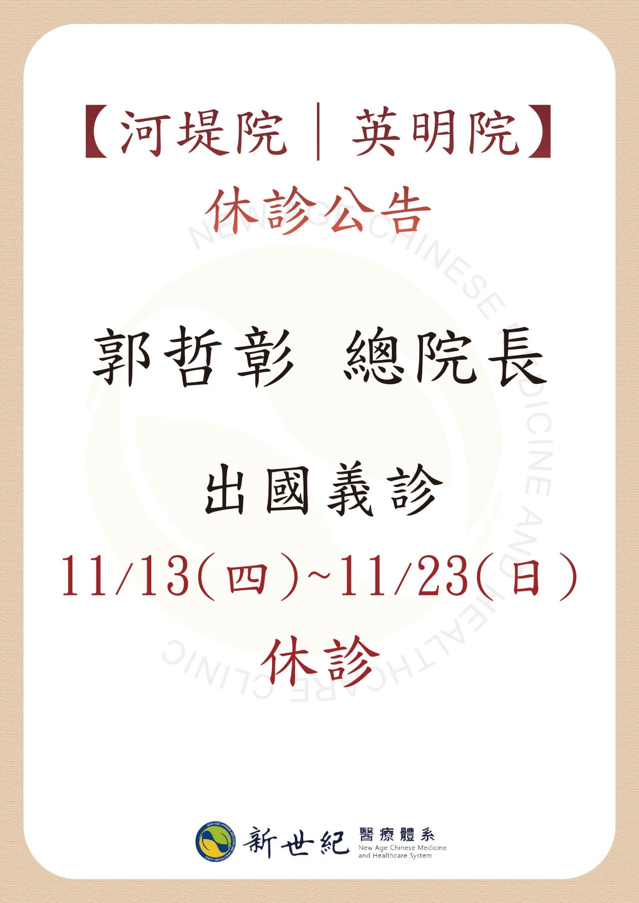 【河堤院、英明院】11/13(四)~11/23(日)郭哲彰總院長 休診